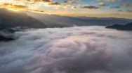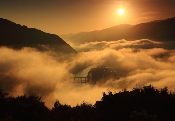 吉野川沿いをゆっくりと立ちのぼる霧が、やがて谷を包みこむように広がり、まるで雲の海のような幻想的な風景を生み出す――。