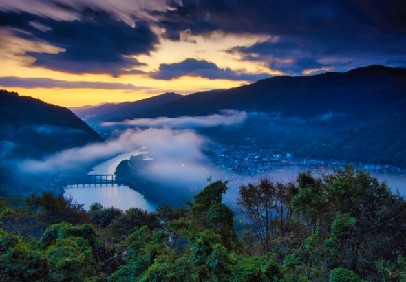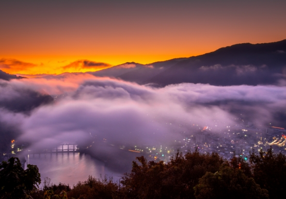 標高約300〜600mに位置する「馬場・西山展望台」は、池田の町並みと雄大な吉野川が一望できる絶景スポットです。秋から春にかけての早朝には、眼下を覆いつくす壮観な雲海が現れることがあり、町と川が雲の海にのみ込まれ、まるでおとぎ話に出てくる幻の町のような光景が広がります。