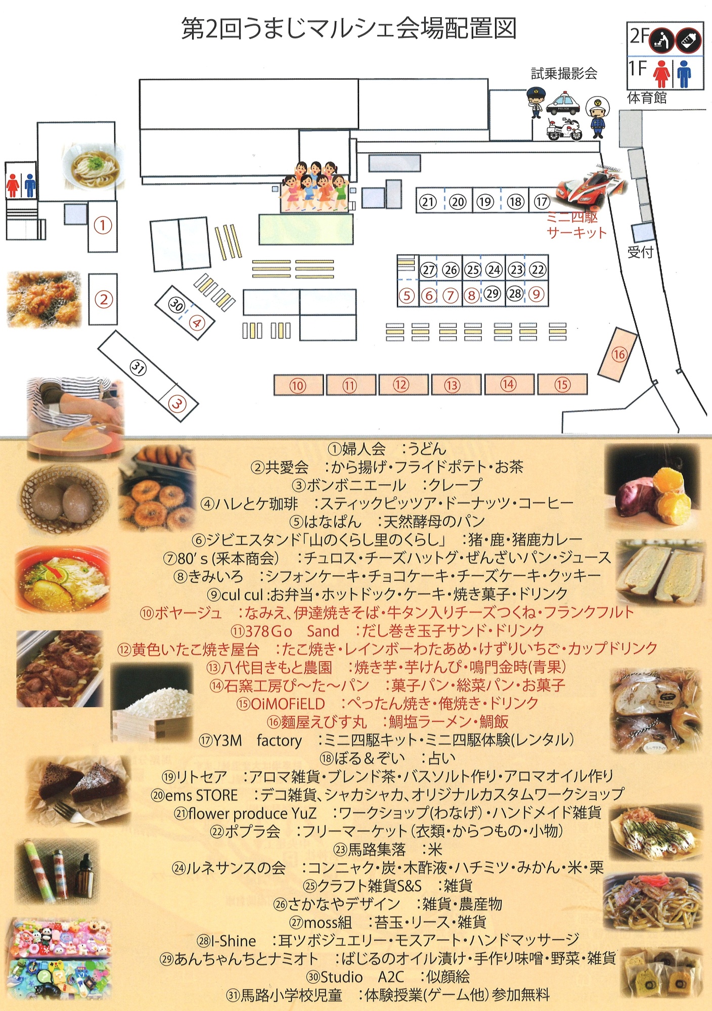 当日は、市内外から集まるキッチンカーによるバラエティ豊かなグルメや雑貨販売、フリーマーケットをはじめ、ミニ四駆体験、似顔絵、ワークショップなどの多彩なブースが並びます。馬路小学校の児童による体験授業も予定されており、地域の子どもたちが活躍する姿も見ることができます。