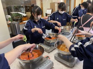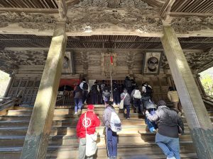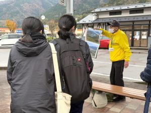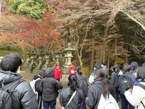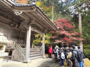 12月5日に山城中学校ふるさと探訪が実施されました。今回のふるさと探訪では、池田町の歴史散策、箸蔵寺訪問や茜染め体験をしました。当日は、冬らしい寒さがありましたが、雨も降らず、まだ紅葉も楽しめました。各訪問先では地元のガイドさんが案内してくれ、生徒の皆さんは経験豊富なガイドさんの説明に熱心に耳を傾けていました。また、茜染め体験では各々が好みの染液を選び、一生懸命に取り組まれていました。本来は準備を含め何日もかかる染色を数時間で体験できますが、温度管理をしながら、1液、2液と浸け、冷たい水でハンカチを洗ったりと、自然の染料で染める大変さや一つとして同じ色のない自然の美しさなど貴重なことを学べ、充実した一日になったのではないでしょうか。今回のふるさと探訪で地元の魅力をたくさん見つけていただけたら嬉しいですね。そしてふるさとの魅力を多くの人に伝えていって欲しいです。ご協力いただいた皆さま本当にありがとうございました。