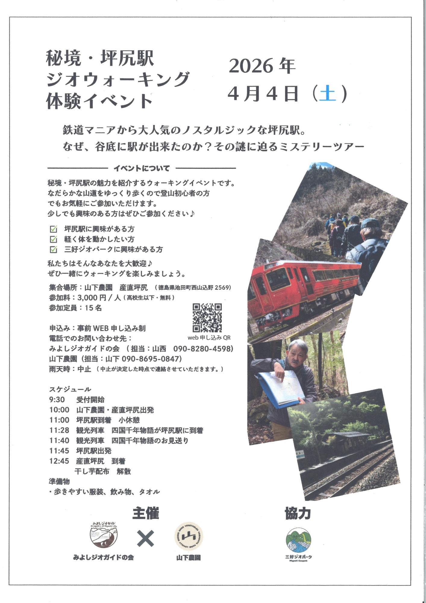 徳島県三好市池田町の坪尻駅周辺にて、体験型イベント「ジオウォーキング」が開催されます。
