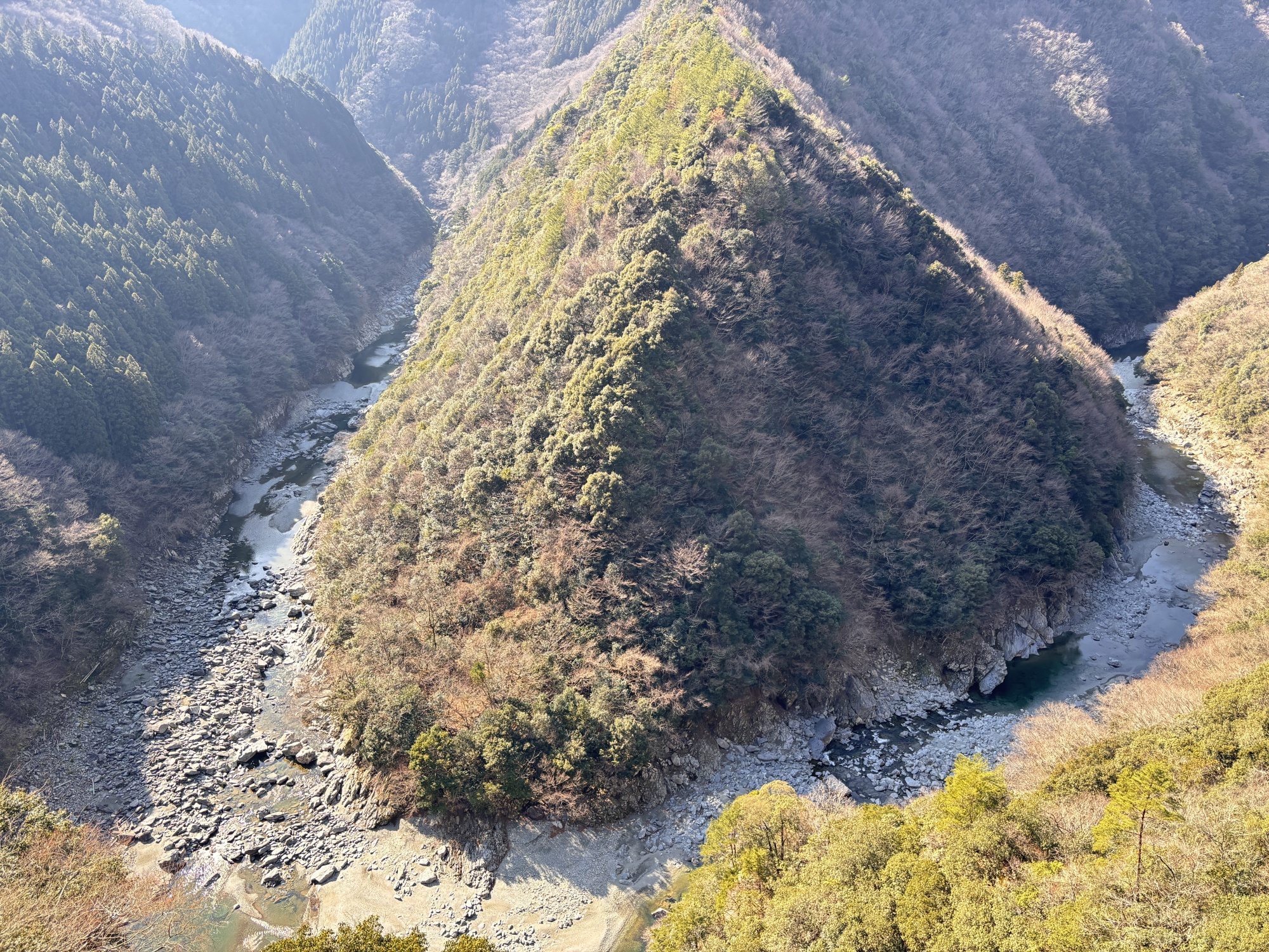 というのも、かずら橋の橋床には10cmほどのさな木が渡されており、さな木とさな木の間は間隔があるので下がよく見えます。